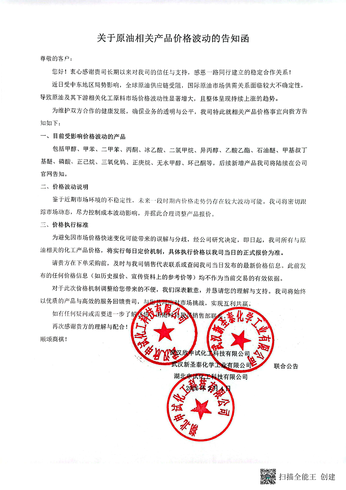 关于原油相关产品价格波动的告知函